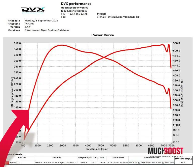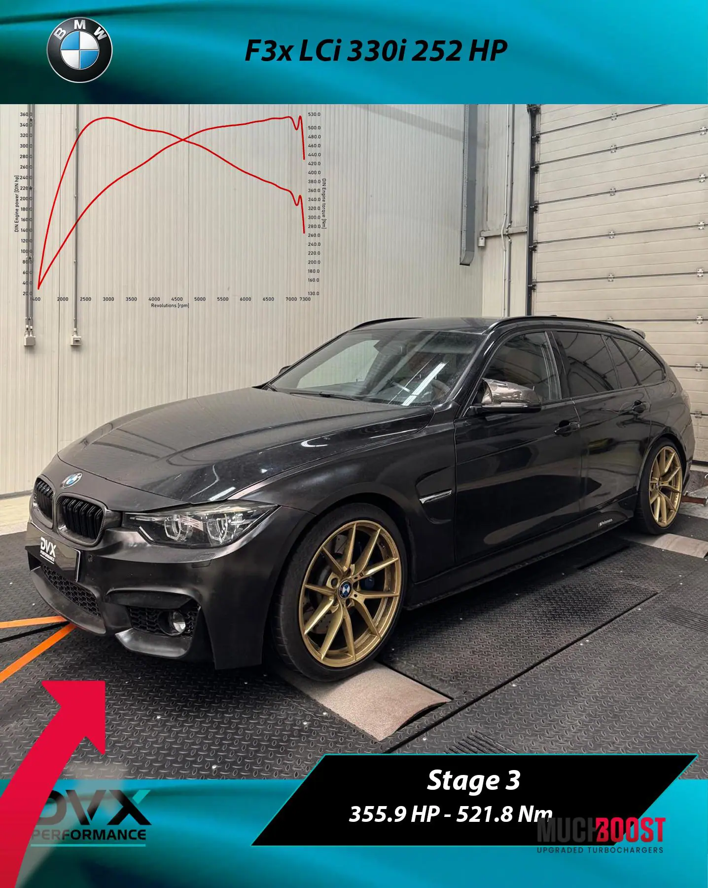 We would like to showcase a great project that used this turbo. A BMW 330i produced 356 HP and 521 Nm of torque, running on 98 RON 98. It was also equipped with a 200-CPSI downpipe and a B58TU HPFP.
